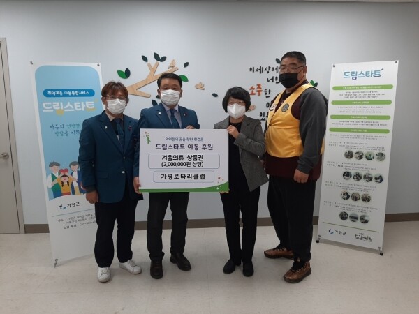 [뉴스써치] 국제로타리 3600지구 가평로타리클럽은 12월 1일 가평읍·북면 지역 저소득 아동을 위해 패딩점퍼 등 필요한 의류를 살 수 있는 200만원상당의 상품권을 준비해 드림스타트에 기탁했다.