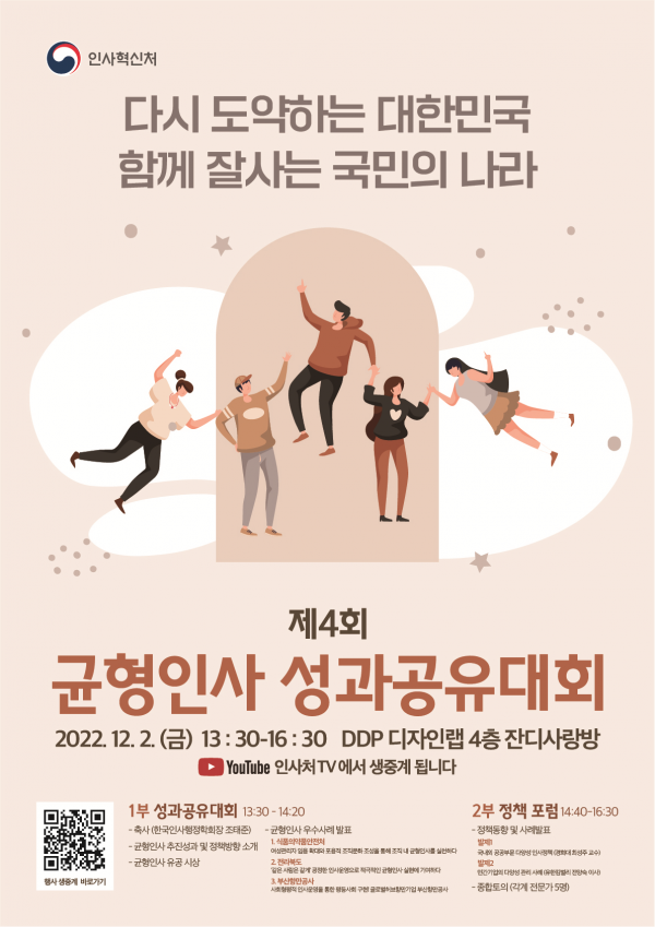 인사혁신처는 2일 서울 동대문디자인플라자에서 중앙부처, 지방자치단체, 공공기관 등이 참여하는 ‘제4회 균형인사 성과공유대회’ 및 ‘균형인사 정책토론회’를 개최했다.