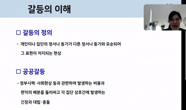 교육은 김은하 강사가 ‘공공갈등의 관리 및 해소’를 주제로 실시간 화상강의를 하는 것으로 이뤄졌다.