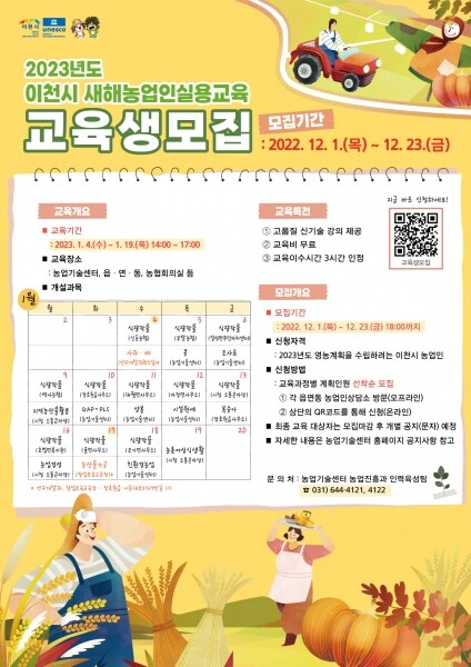자세한 일정은 이천시농업기술센터 홈페이지에 게시되어 있으며 기타 문의사항은 농업기술센터 농업진흥과 인력육성팀으로 전화하면 안내받을 수 있다.