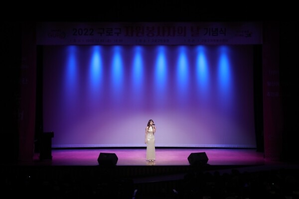 ‘사진 3’ 지난 2일 구로구민회관에서 열린 자원봉사자의 날 기념행사에서 손지은 팝소프라노가 축하공연을 하고 있다.
