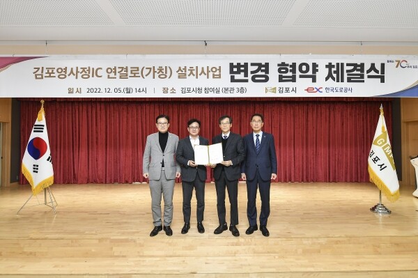 김포시는 12월 5일 오후 2시 본청 3층 참여실에서 김포시와 한국도로공사 간 ‘김포영사정IC 연결로 설치사업 변경 협약’을 체결했다.