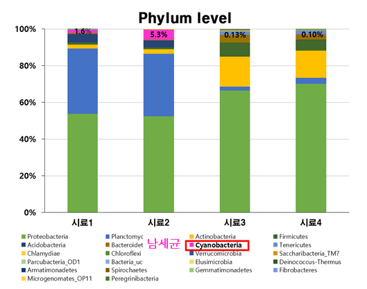 남세균 디엔에이는 소량 검출 되었으나, 분석법의 한계로 마이크로바이옴 분석결과만으로는 검출된 남세균 디엔에이의 활성도를 확인할 수 없었다.