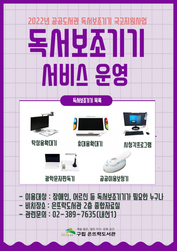 2층 종합자료실에 설치된 독서보조기기는 탁상용 독서확대기 휴대용 독서확대기 광학문자판독기 화면 낭독 프로그램 화면 확대 프로그램 공공 보청기 총 6종이다.