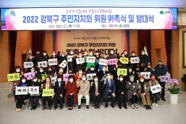 이순희 강북구청장을 비롯한 내빈과 주민자치위원 등 250여명이 참석했으며 경과보고 위촉장 수여 우리의 다짐 주민자치회 기능과 역할 위원의 의무 안내 순으로 진행됐다.