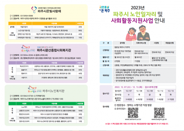 최희진 노인장애인과장은 “어르신들의 활기차고 건강한 노후생활 지원을 위해 파주시에서는 매년 꾸준히 노인 일자리를 늘리고 있다”며 “내년에도 다양하고 많은 일자리를 준비한 만큼 많은 관심과 참여를 바란다”고 말했다.