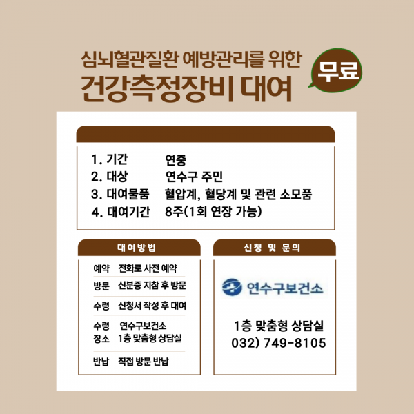 연수구에서는 고혈압, 당뇨병의 예방관리를 위한 자가 건강관리 능력 향상과 지속치료율을 높임으로써 합병증 예방을 돕고자 기초건강측정장비 대여서비스를 운영 중에 있다.
