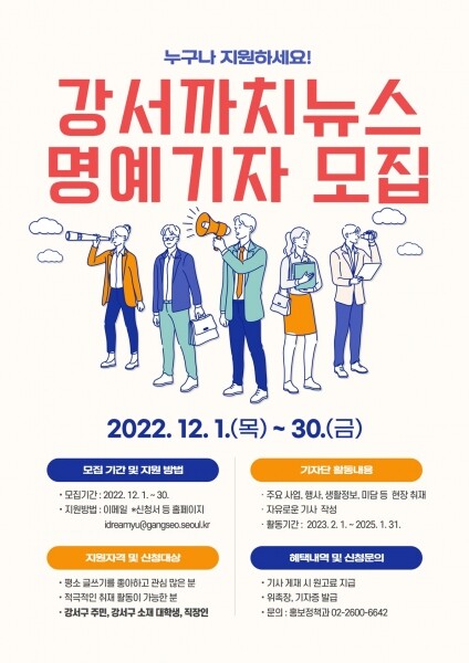 강서구민이면 누구나 지원이 가능하며 글쓰기, 취재에 관심 있는 강서구 소재 대학생·직장인도 지원할 수 있다.