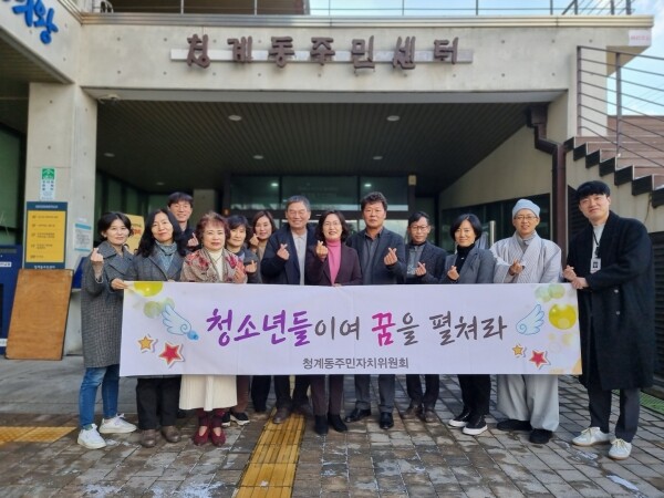 이날 청계동주민자치위원회는 연말 청소년과 청년들에게 꿈과 희망의 메시지를 전달하고자 명륜보육원, 청계꿈의학교, 주간보호시설 등 관내 사회복지시설 4개소에 기부금을 전달했다.