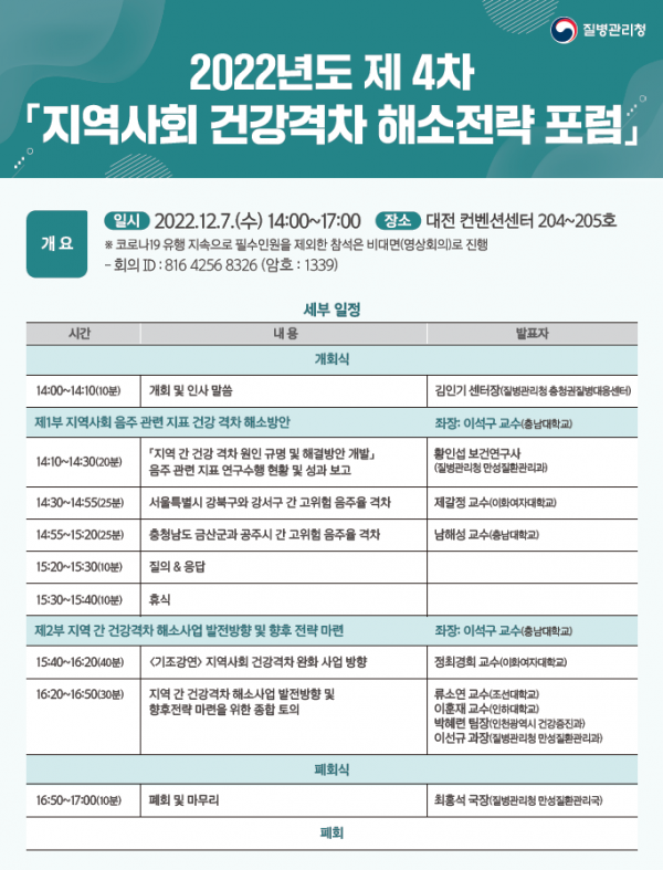 제4차 포럼은 음주 관련 건강지표 및 격차 개선을 주제로 질병관리청 및 충청권질병대응센터가 공동으로 주최하며 시·도 및 시·군·구 보건소, 건강지표 전문가와 함께 건강격차 해소를 위한 전략방안을 논의한다.