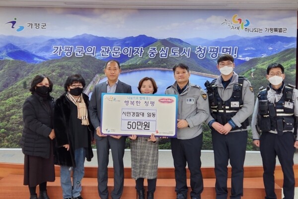 지병록 청평면장은 “코로나로 힘든 가운데에도 잊지 않고 나눔을 위해 힘써주시는 청평면 시민 경찰대 일동에게 감사드린다 기탁된 현금은 도움이 필요한 곳에 소중히 잘 전달하겠다”고 전했다.
