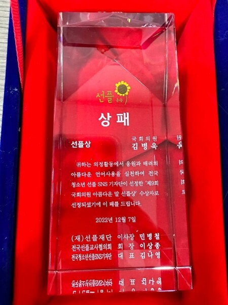 김병욱 의원은 “청소년이 직접 선정해 주는 상이라고 생각하니 의미가 크고 책임을 막중하게 느낀다”며 “정쟁과 고성이 빈번한 국회에서 모지고 날이 선 말로 서로 상처를 주지 않고 삶의 모든 영역에서 희망을 줄 수 있는 정치인이 되도록 노력하겠다”고 소감을 밝혔다.