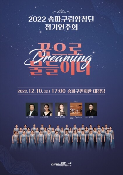 서강석 송파구청장은 “코로나19를 극복하고 3년 만에 개최되는 송파구립합창단의 공연이 다가오는 연말을 맞이해 많은 구민들에게 감동과 따뜻함을 전할 수 있는 시간이 되었으면 좋겠다”고 밝혔다.