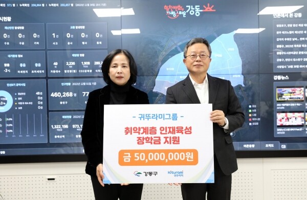 경제적인 부담으로 배움이 어려운 취약계층 학생들이 배움의 기회를 놓지 않고 재능을 마음껏 펼칠 수 있도록 귀뚜라미그룹과 귀뚜라미장학재단에서 장학금 5천만원을 강동구에 기부했다.