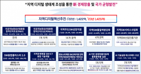 한편 2023년에는 지역들의 수요를 반영해 지역 내 디지털 기반 조성, 지역 디지털 기업의 육성, 지역 디지털 인재의 양성 및 디지털 기반 사회문제해결 등의 분야에서 총 1,425억원을 지원해 지역 디지털 생태계 조성을 통한 지역경제 활성화 및 국가균형발전에 기여할 계획이라고 전했다.