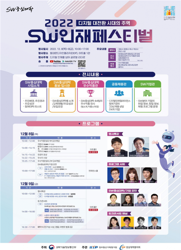 ? 또한, 소프트웨어중심대학과 소프트웨어기업에서 인공지능·소프트웨어 등 디지털 분야에 관심이 있는 학생과 일반인을 대상으로 인공지능의 미래, 생활 속 소프트웨어, 개발자의 성장, 정보기술기업이 바라는 개발자 덕목 등에 대한 강연을 펼친다.