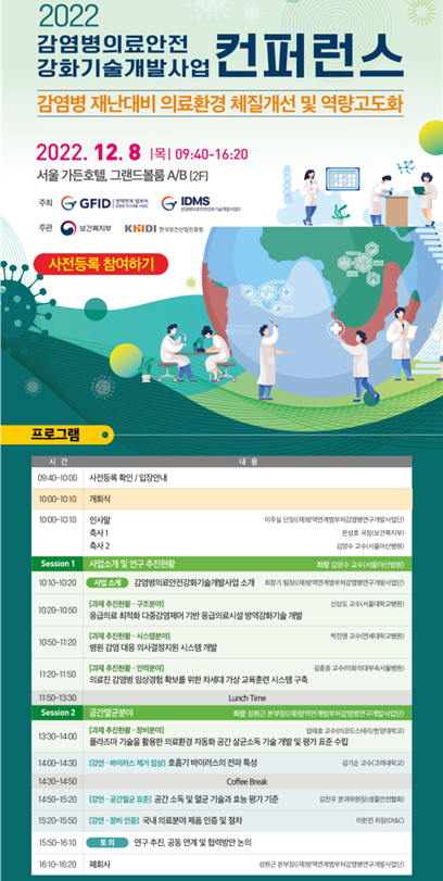 이번 컨퍼런스에서는 감염병의료안전강화기술개발사업을 통해 수행 중인 4개 분야의 연구개발과제들을 소개하는 시간과 함께, 코로나19 이후 필요성이 강조되고 있는 의료환경의 오염 제거방법 등 “공간멸균 분야”를 주제로 강연 및 토론의 자리를 마련해 제품화 등 실질적인 성과도출을 위한 관련 분야 전문가 의견수렴 및 협력방안을 논의한다.