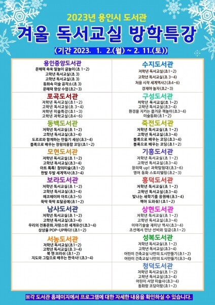 독서 교실과 방학 특강은 내년 1월2일부터 2월10일까지 용인중앙·포곡·동백·모현·보라·남사·서농·수지·구성·죽전·기흥·흥덕·상현·성복·청덕 등 관내 15개 공공도서관에서 진행된다.
