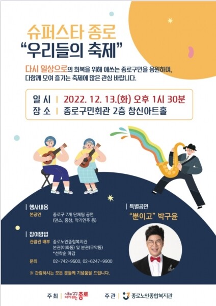 종로구가 주최하고 종로노인종합복지관이 주관하는 이날 행사는 휘황찬락의 식전 국악공연으로 시작해 오후 2시부터 개회사 축사 무대발표 감사장 전달 초대가수 특별공연 경품·기념품 지급 순으로 이어진다.