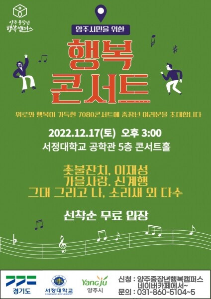 이번 콘서트는 양주 중장년 행복캠퍼스 제1회 졸업생 배출을 기념하는 동시에 한 해를 마무리하는 양주시민들에게 음악과 함께 행복을 전하고자 마련됐다.
