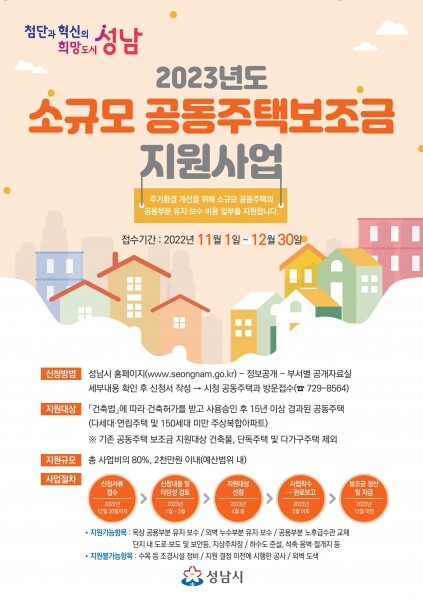 지원 신청서 등의 서류를 갖춰 기한 내 성남시청 7층 공동주택과 사무실을 방문 접수해야 한다.