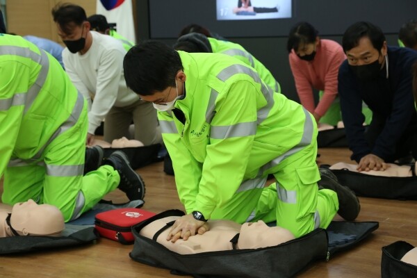 지난 12월 2일 ‘2022년 4분기 모범 환경미화원 표창 및 산업안전보건교육’에서 진행된 심폐소생술 교육에는 구 환경미화원 및 대행업체 산업안전보건 담당자 등 약 100여명이 참여했다.