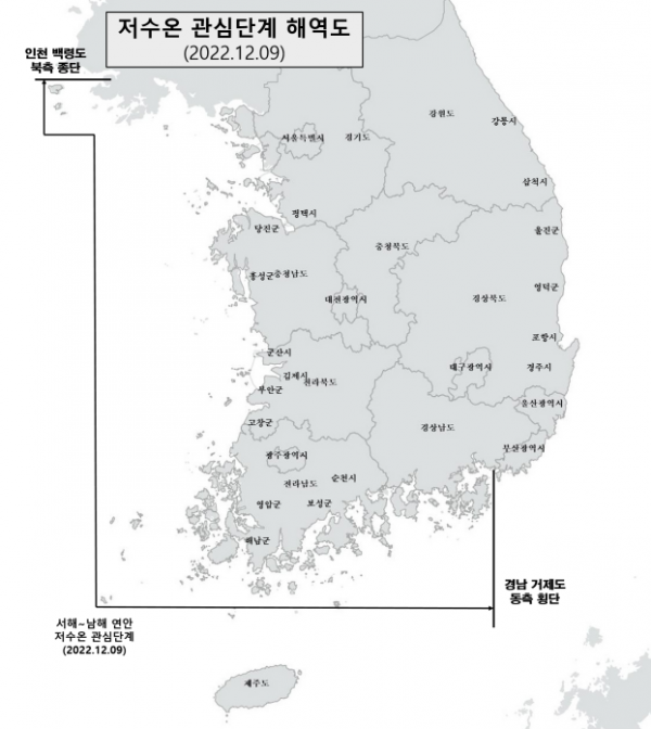 올 겨울 수온은 평년보다 다소 낮거나 비슷한 분포를 보일 것으로 예상되나, 11월 말 시작된 강한 한파에 의해 최근 수온이 평년보다 다소 낮아짐에 따라 지난해 보다 2주 정도 빠르게 ‘저수온 관심’ 단계가 발표됐다.