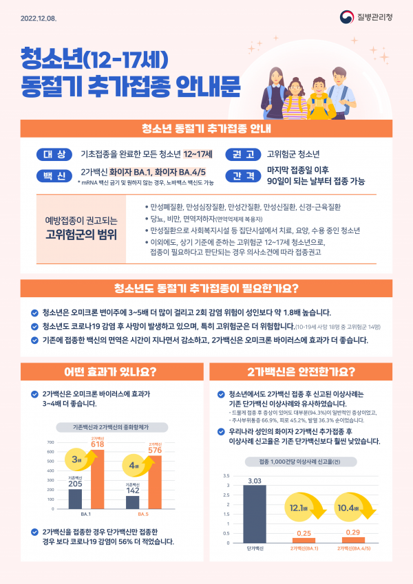 백경란 청장은 “청소년은 오미크론 변이주에 3~5배 더 쉽게 걸리고 두 번째 감염 위험이 성인보다 약 1.8배 높으므로 면역저하자 및 기저질환자 등 고위험군은 2가백신 접종에 적극 참여해 줄 것”을 요청했다.