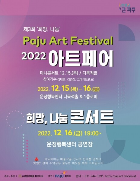 15일부터 16일까지 이틀간 진행되는 ‘아트페어’는 파주예총의 전문예술인들이 미술· 사진·시화작품을 전시·판매하는 행사로 운정행복센터 다목적홀과 1층 로비에서 열리며 지역가수 김대현, 김명상, 그레이스밴드가 함께하는 미니콘서트도 즐길 수 있다.