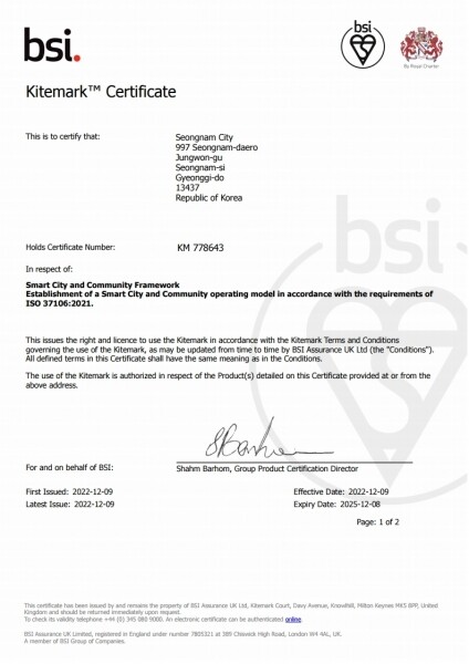 ▲ 성남시, 영국표준협회 스마트도시 국제 인증받아