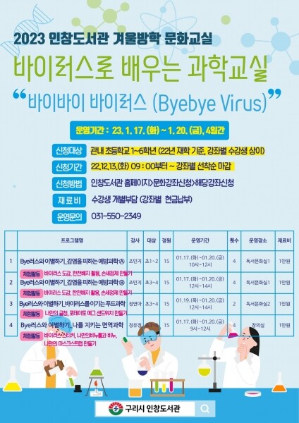 겨울방학 문화교실은 ‘바이러스로 배우는 과학교실 : 바이바이 바이러스 ’라는 주제로 오는 2023년 1월 17일부터 20일까지 4일간 운영된다.