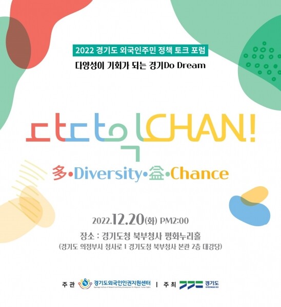 경기도 외국인 인권지원센터는 ‘다양성이 기회가 되는 경기도’를 주제로 ‘2022 경기도 외국인주민 정책 토크 포럼?다다익찬’을 오는 20일 오후 2시 경기도청 북부청사 평화누리홀에서 개최한다고 13일 밝혔다.