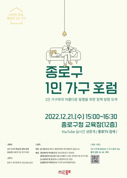 ‘1인 가구와의 아름다운 동행을 위한 정책방향 모색’을 주제로 실효성 있는 지원책을 고민하고 정책 방향에 대한 공감대를 형성하기 위한 자리다.
