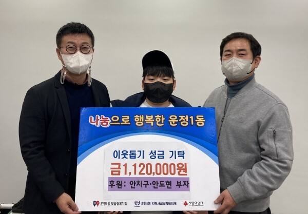 안치구·안도현씨 부자는 지난 9일 파주시 운정1동 행정복지센터를 찾아 연말연시 어려운 이웃들을 위해 써달라며 이웃돕기 성금 112만원을 기탁했다.