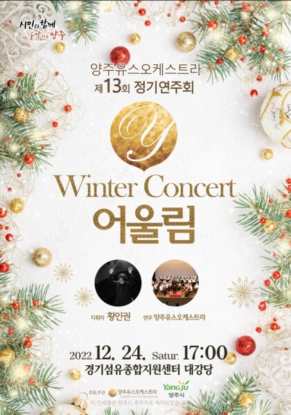 한편 양주 유스오케스트라는 2009년에 창단해 올해로 창단 14년차의 관록있는 청소년 오케스트라로서 황인권 지휘자와 악기별 코치들의 세심한 지도를 통해 그동안 지역사회공헌 공연, 찾아가는 연주, 정기연주회 등 활발한 연주활동을 추진해왔다.