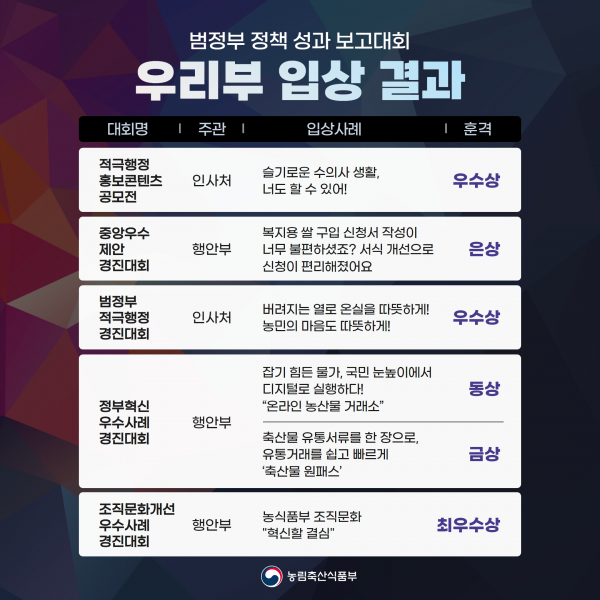 그 외에도 ‘조직문화 개선 우수사례 경진대회’, ‘중앙우수제안 경진대회’ 및 ‘적극행정 홍보콘텐츠 공모전’에서도 각각 최우수상, 은상 및 우수상을 수상하는 등의 성과를 거뒀다, 아울러 농식품부 직원들이 적극행정과 공직문화 혁신에 앞장서서 노력한 결과 2022년 적극행정업무와 적극행정국민신청제에서도 각각 유공자로 선정되는 성과를 거뒀다.