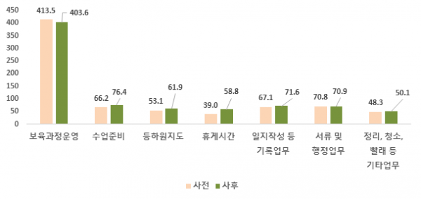 전반적으로 근무시간은 감소했으나, 수업준비 및 기록업무 시간과 양육자와의 일상적 소통이 이루어지는 등·하원 지도시간은 증가했다.