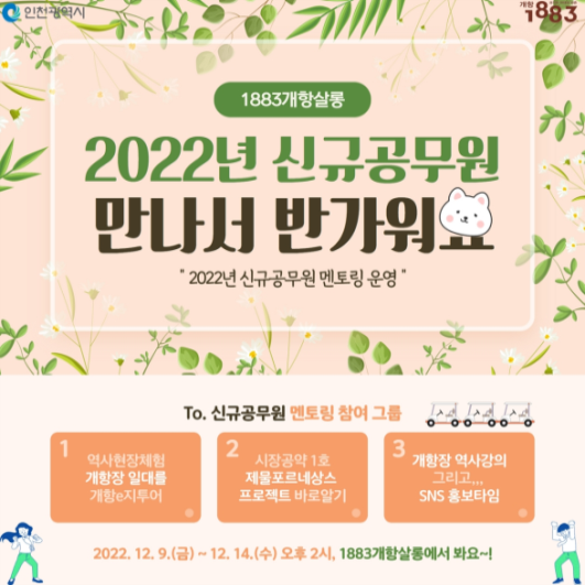 한편 시는 약 160여명을 대상으로하는 ‘2022년 신규공무원 멘토링’ 프로그램을 통해 1883개항살롱 외에도 남동정수사업소를 견학할 계획이라고 전했다.