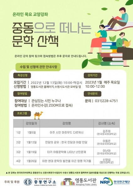 [뉴스써치] 수원시 영통도서관이 한국외국어대학교와 협력해 운영하는 인문학 강좌 ‘중동으로 떠나는 문학 산책’ 참가자를 선착순으로 모집한다.