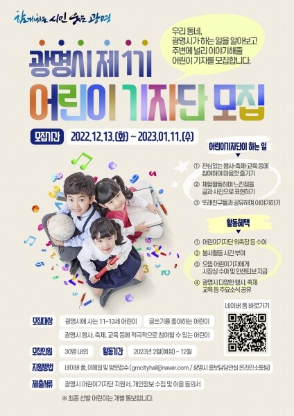 [뉴스써치] 광명시는 어린이들에게 광명시를 알리고 시정 홍보에 능동적으로 참여할 수 있는 기회를 제공하고자 광명시 제1기 어린이기자단을 내년 1월 11일까지 모집한다.