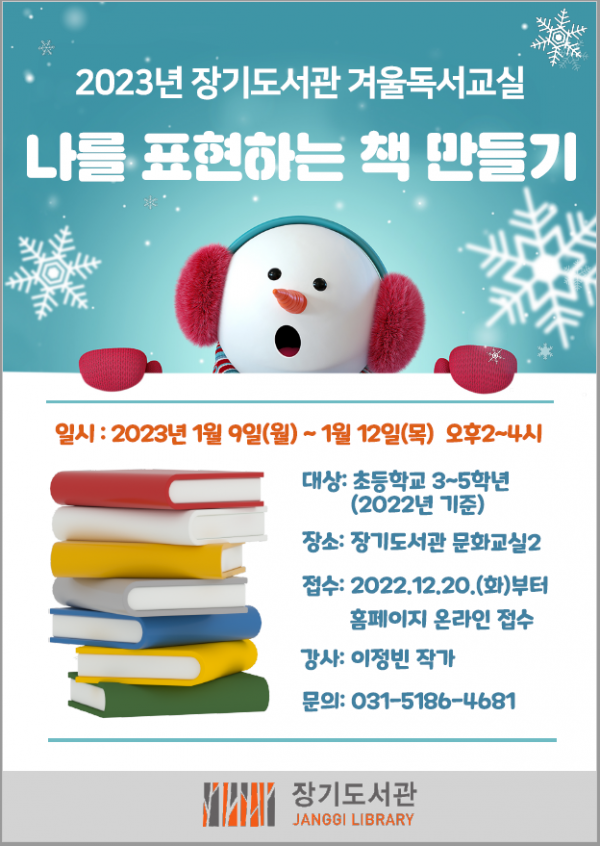 [뉴스써치] 김포시 장기도서관은 겨울방학을 맞은 관내 초등학생 3~5학년생을 대상으로 2023년 1월 9일부터 12일까지 나흘간 겨울독서교실 ‘나를 표현하는 책 만들기’ 프로그램을 운영한다.
