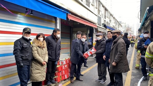 권혁규 고양시건축사회 회장과 임원 4명이 참석해 영세상가 분말소화기 40여 개를 직접 전달하고 취약 시설물에 대한 사전 점검을 실시했다.