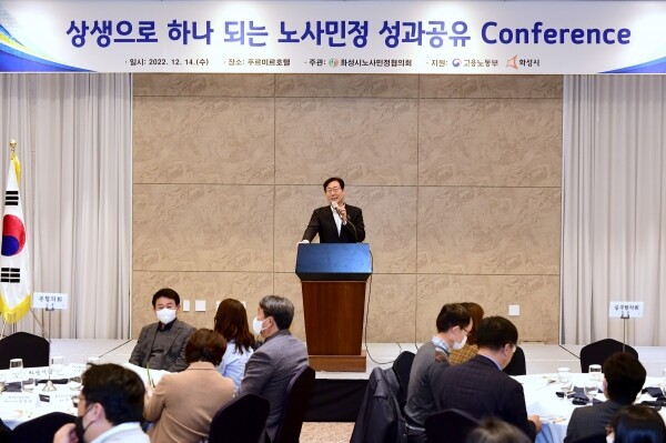 14일 화성시 안녕동 푸르미르 호텔에서 열린 ‘2022년 노사민정 성과공유 콘퍼런스’에는 정명근 화성시장을 비롯해 화성시 노사민정 참여 기관·단체 관계자 80여명이 참여하는 가운데 개최됐다.
