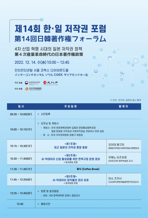 이어 일본 와세다 대학교 법학학술원 우에노 타츠히로 교수가 ‘인공지능·거대자료 산업 활성화를 위한 면책 규정 운영 경과’를, 일본 규슈 대학 대학원 예술공학연구원 아소 츠카사 준교수가 ‘인공지능·거대자료 창작물의 권리 보호’를 주제로 각각 이야기하고 질의에 응답할 예정이다.