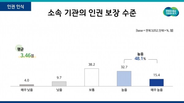 경기도는 인권친화적인 공직문화 조성을 위해 지난 10월 2주간 공무원과 소방공무원, 공무직 등 도청 직원 3,052명을 대상으로 ‘경기도청 인권상황 실태조사’를 실시한 결과 ‘인권보장 수준’의 경우 전체 응답자의 48.1%가 높은 수준이라고 평가했다고 15일 밝혔다.
