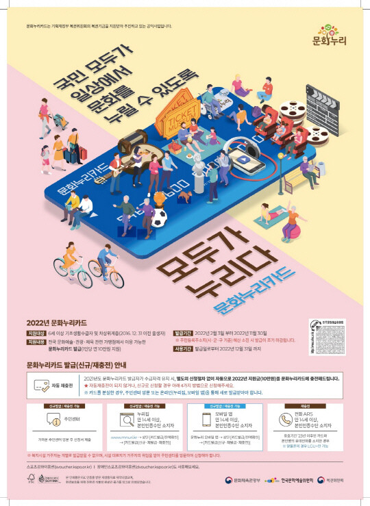 ‘문화누리카드’는 소외계층의 삶의 질 향상과 문화 격차 완화를 위해 문화 혜택을 지원하는 바우처 사업으로 문화예술뿐 아니라 국내 여행, 체육 활동 등에 사용할 수 있다.