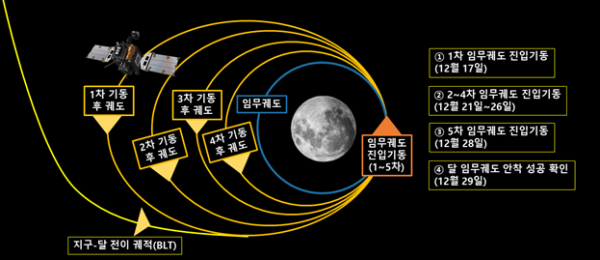 이후 다누리는 12월 17일부터 12월 28일까지 총 5차례의 임무궤도 진입기동을 거쳐 달 임무궤도에 안착할 예정이다.