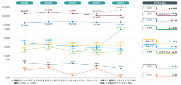 자살은 소폭 증가, 감염병 분야는 코로나19로 인해 사망자 수가 큰 폭으로 증가 했다.
