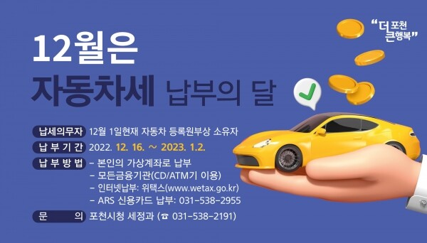 이번 자동차세 납세의무자는 12월 1일 현재 자동차 등록원부상 소유자로 연납 차량이나 연세액 10만원 이하 차량은 과세대상에서 제외됐다.