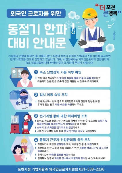 시는 ‘외국인 근로자를 위한 동절기 한파 대비 안내문’을 포천상공회의소와 외국인을 고용하고 있는 사업주에게 안내했으며 관계 현수막을 공단 입구 등 12개소에 설치했다.